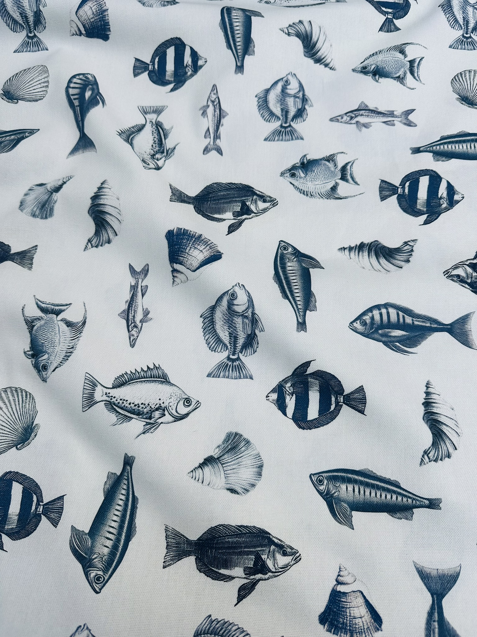 Navy Fish Fabric – Coastal Cotton Material with Seashell Print for Home Decor, Curtains, Cushions and Crafts – 140cm Wide