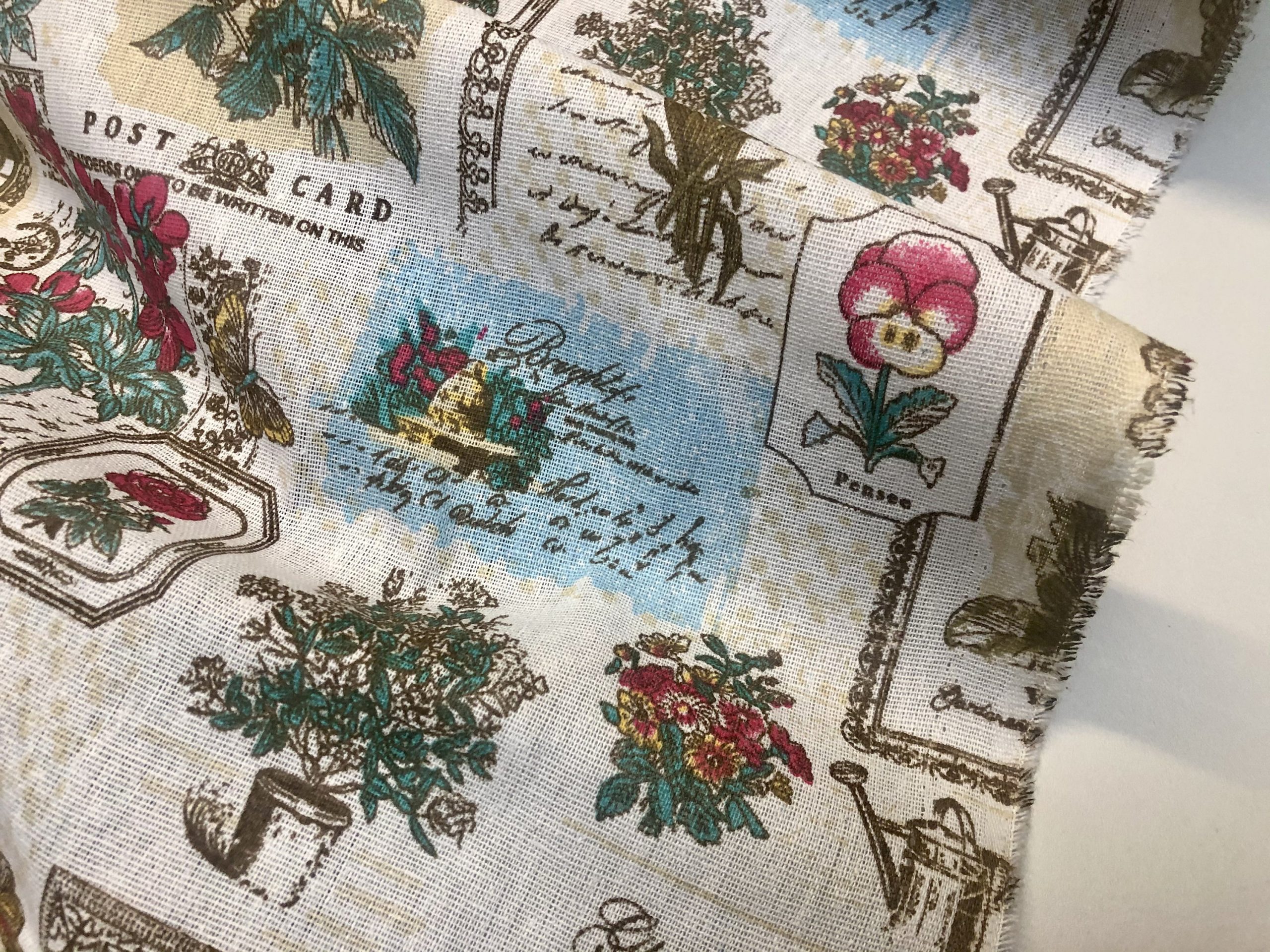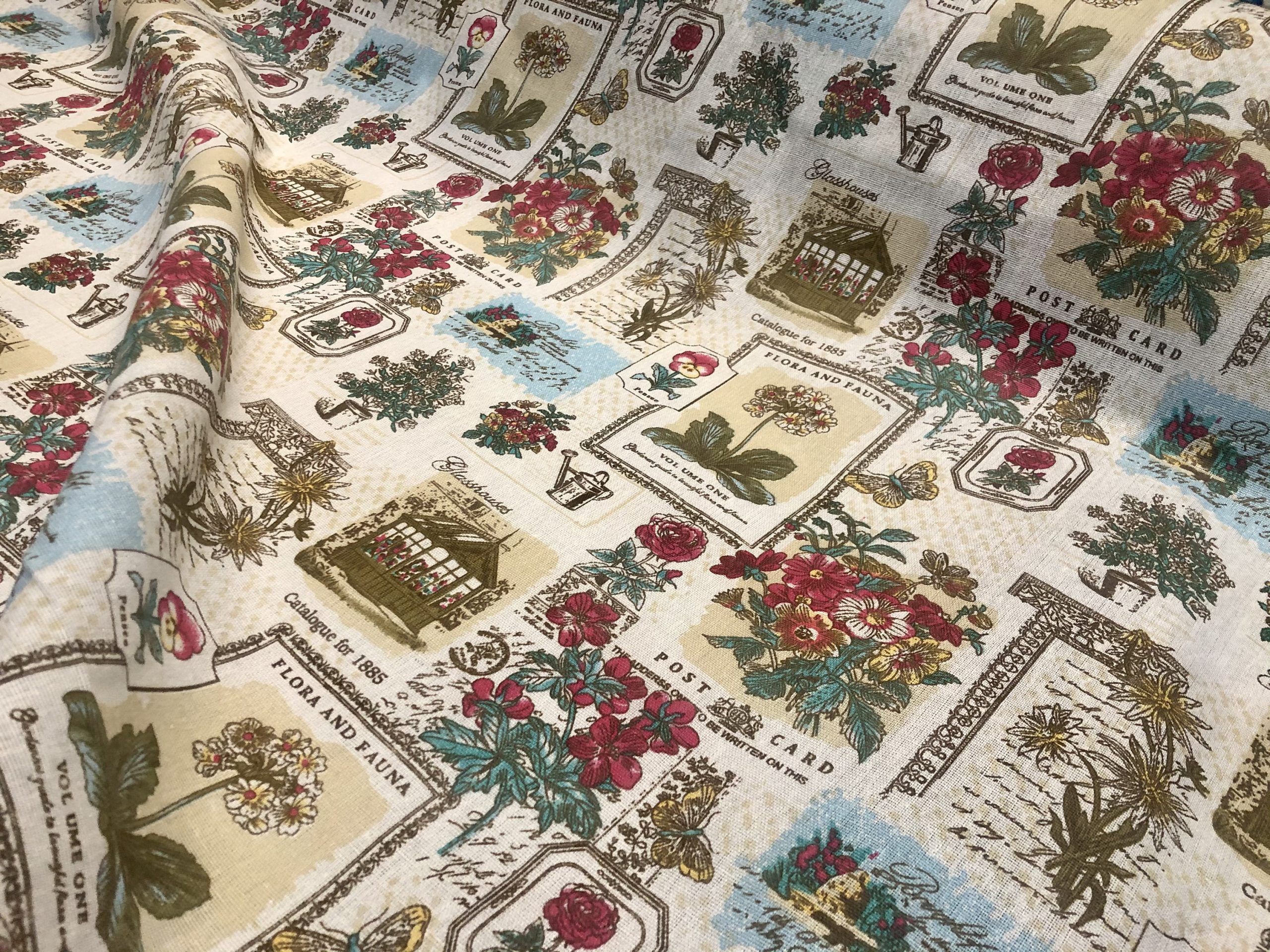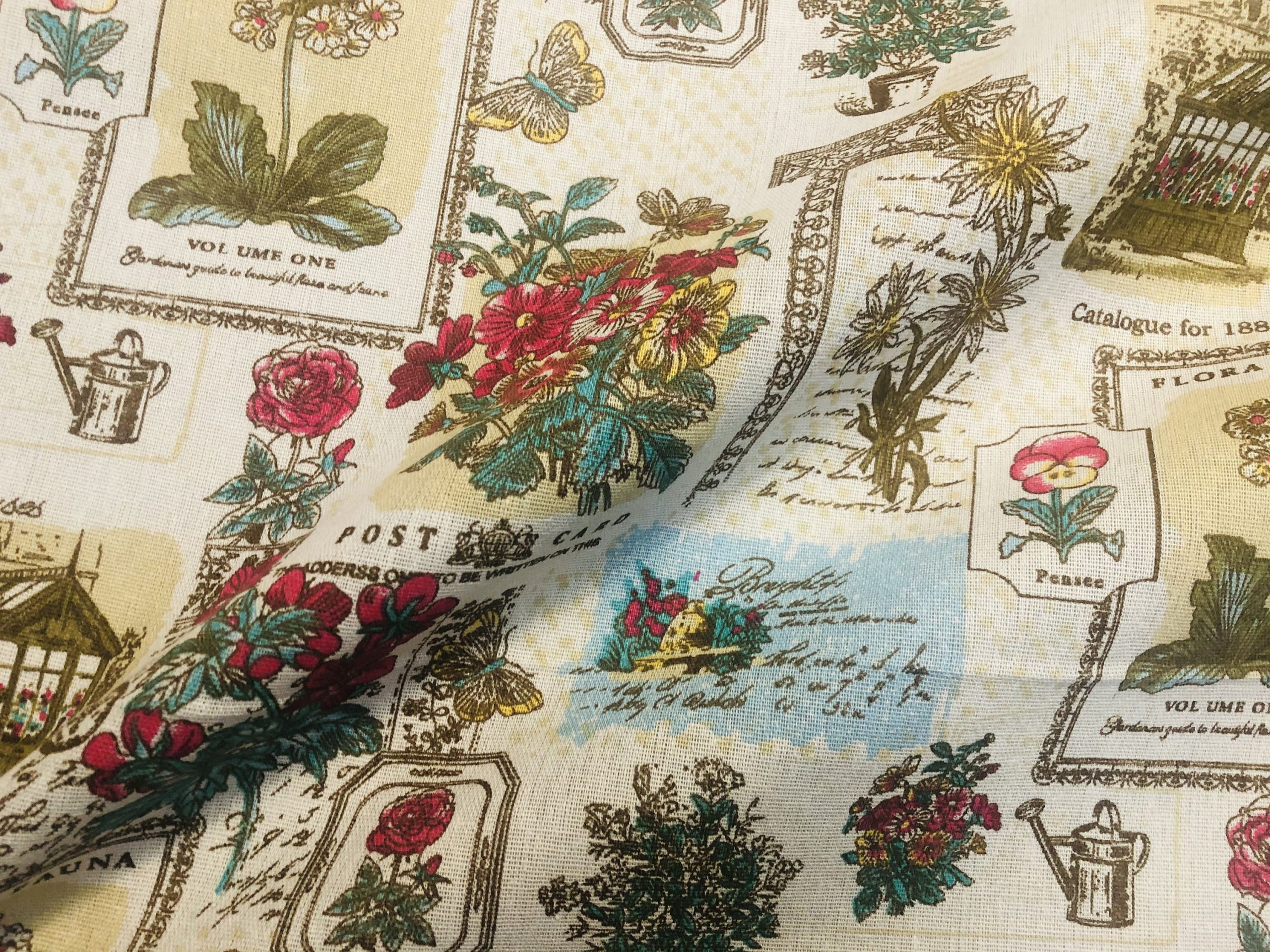 The pattern includes a botanic garden, greenhouse/glasshouse, watering can, butterfly, postcard stamps, letters/message, flower bouquets, plants in pods, various flowers such as roses, pensee (pensy), primrose and etc.