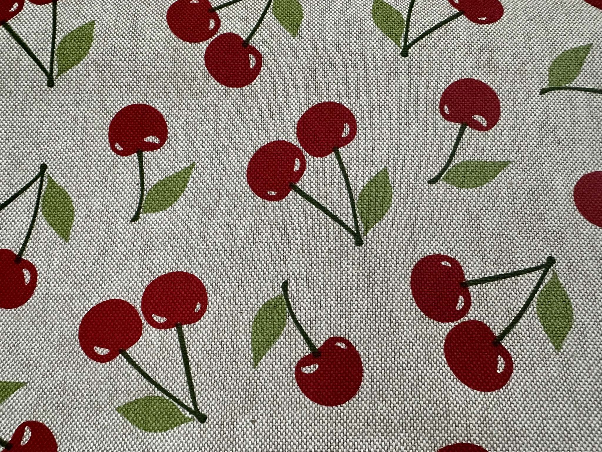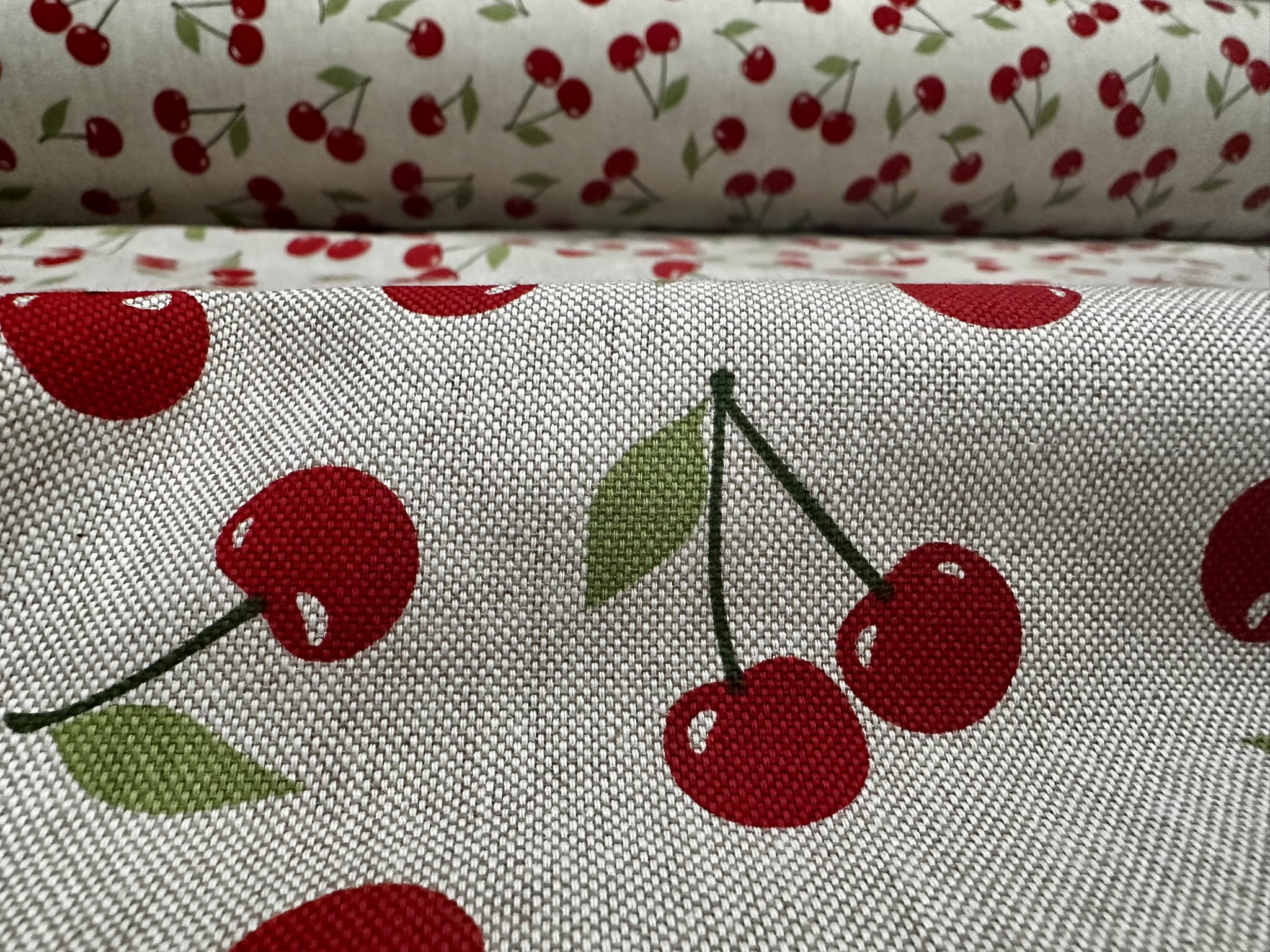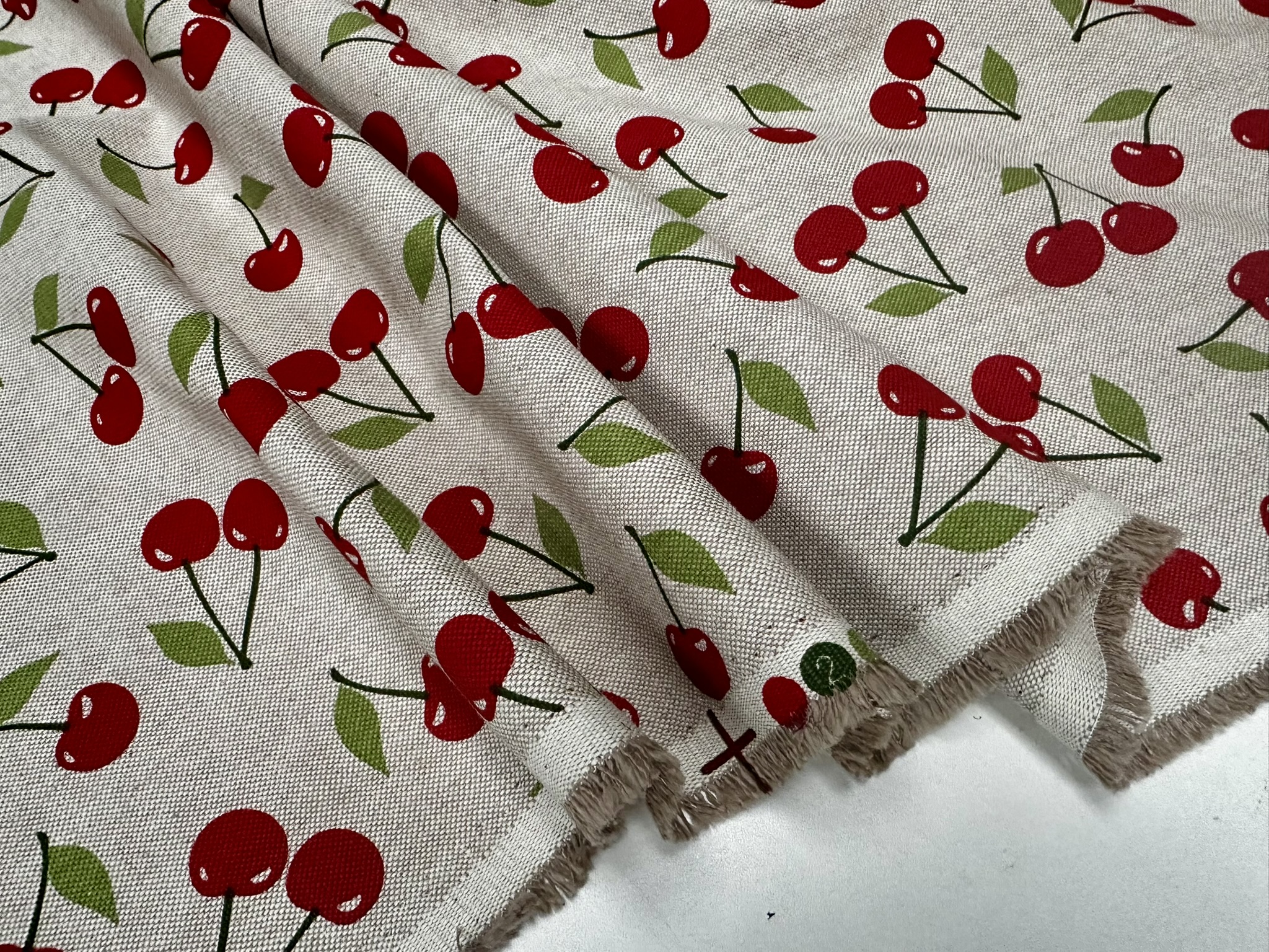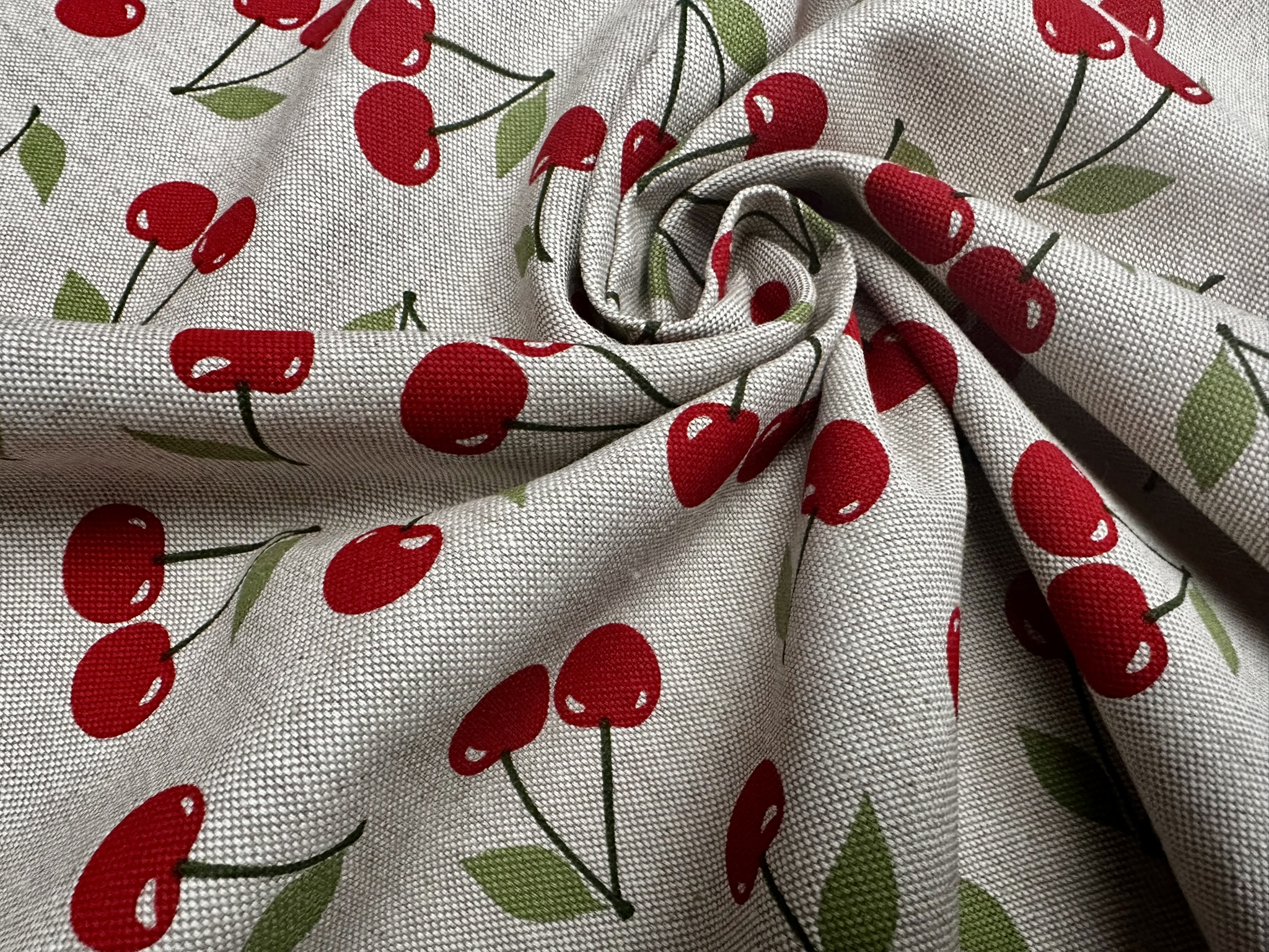 Add a playful and timeless touch to your home with this beautiful cherry print fabric, featuring vibrant red cherries and fresh green leaves on a natural linen-look background.