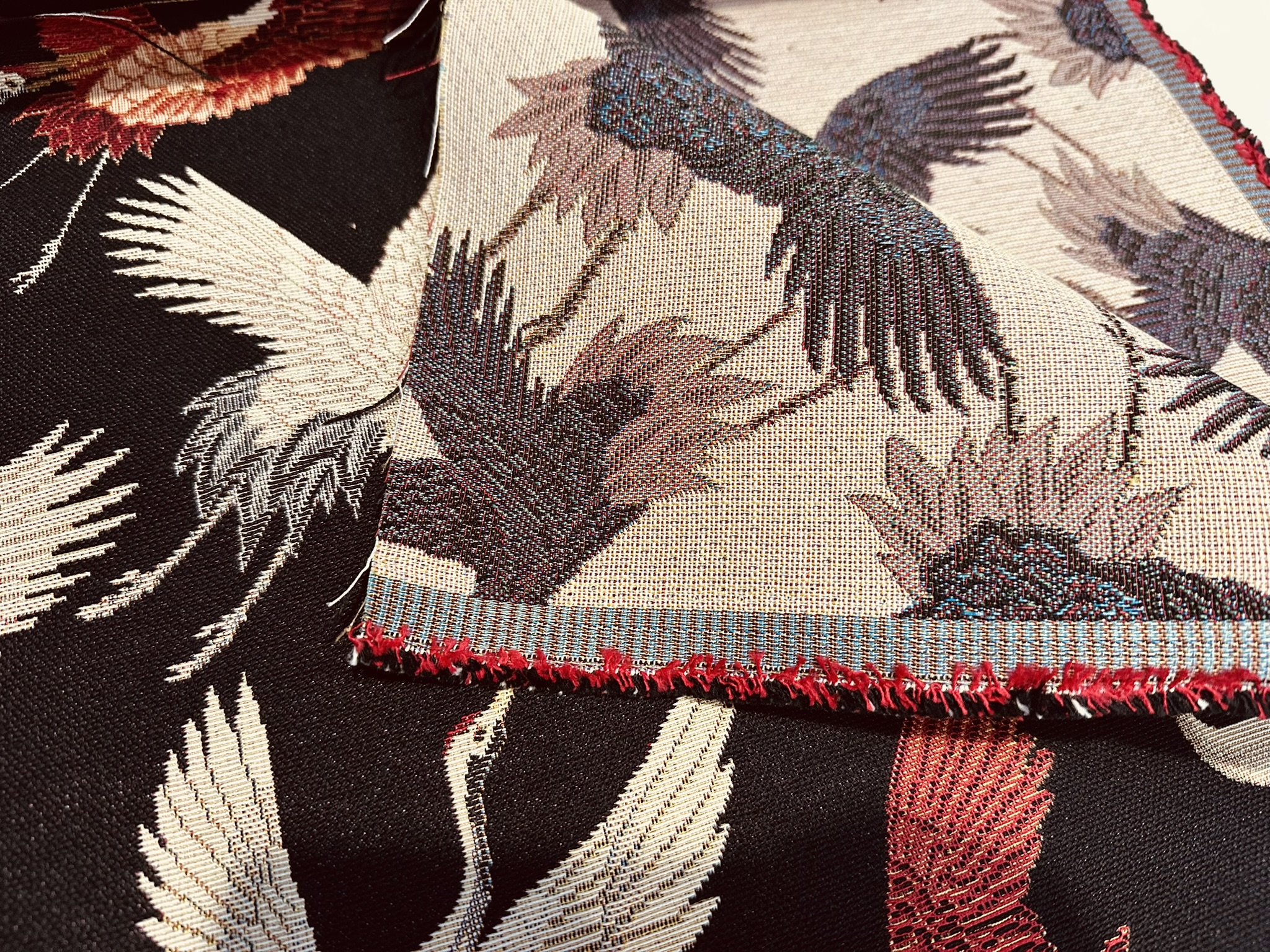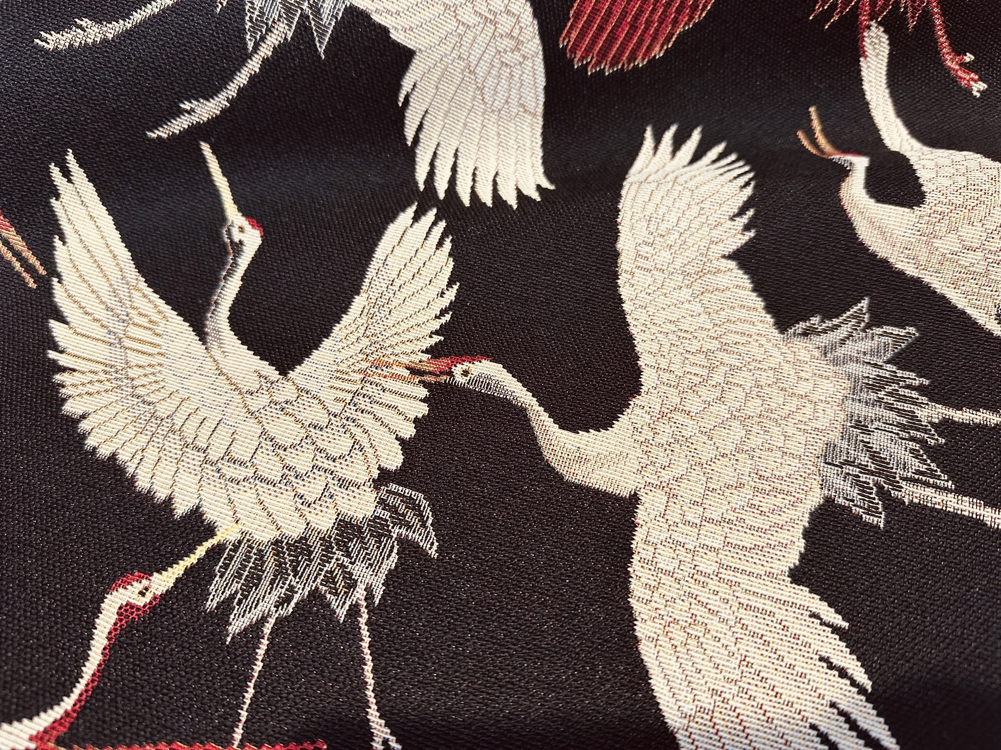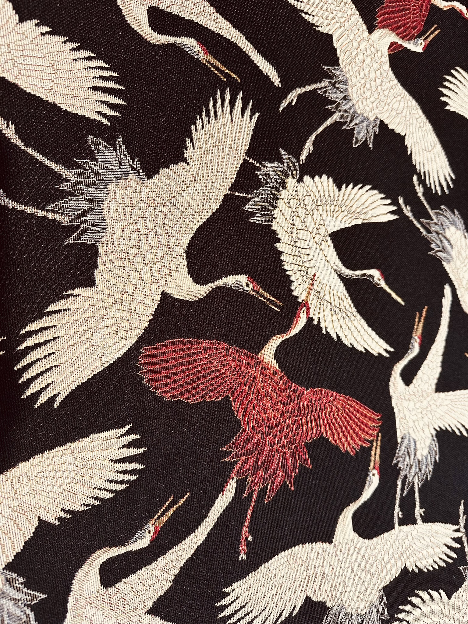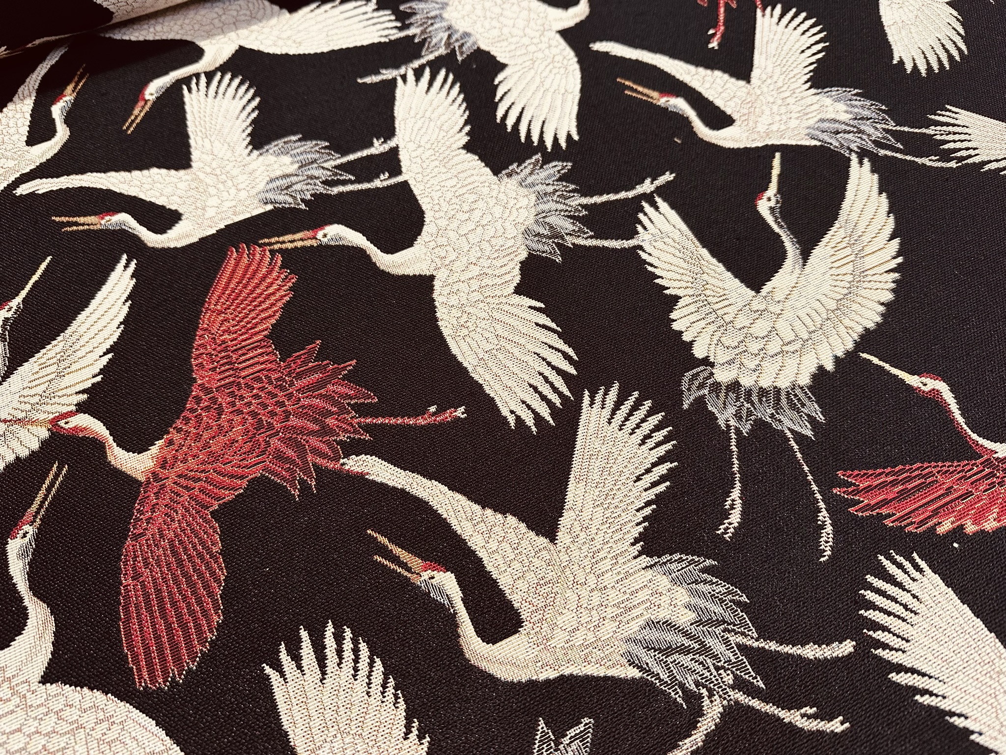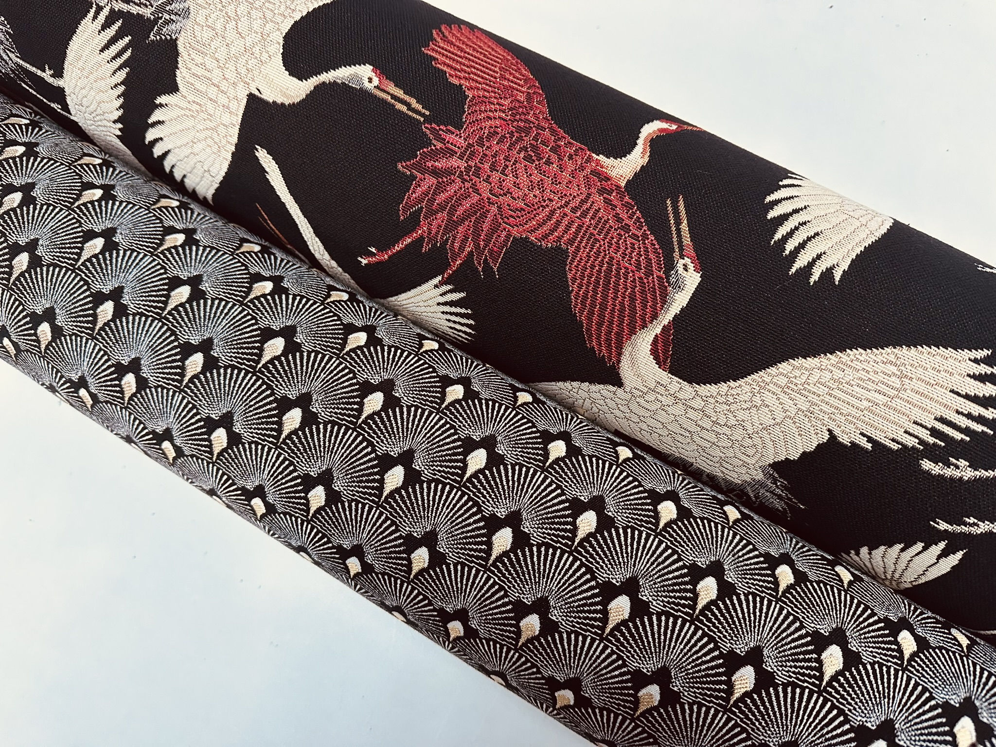 Bring timeless elegance into your interior with this premium Crane Bird Gobelin fabric, featuring graceful flying cranes woven into a rich dark background. Inspired by classic Asian art, the detailed cream, grey and deep red birds create a refined and striking statement.