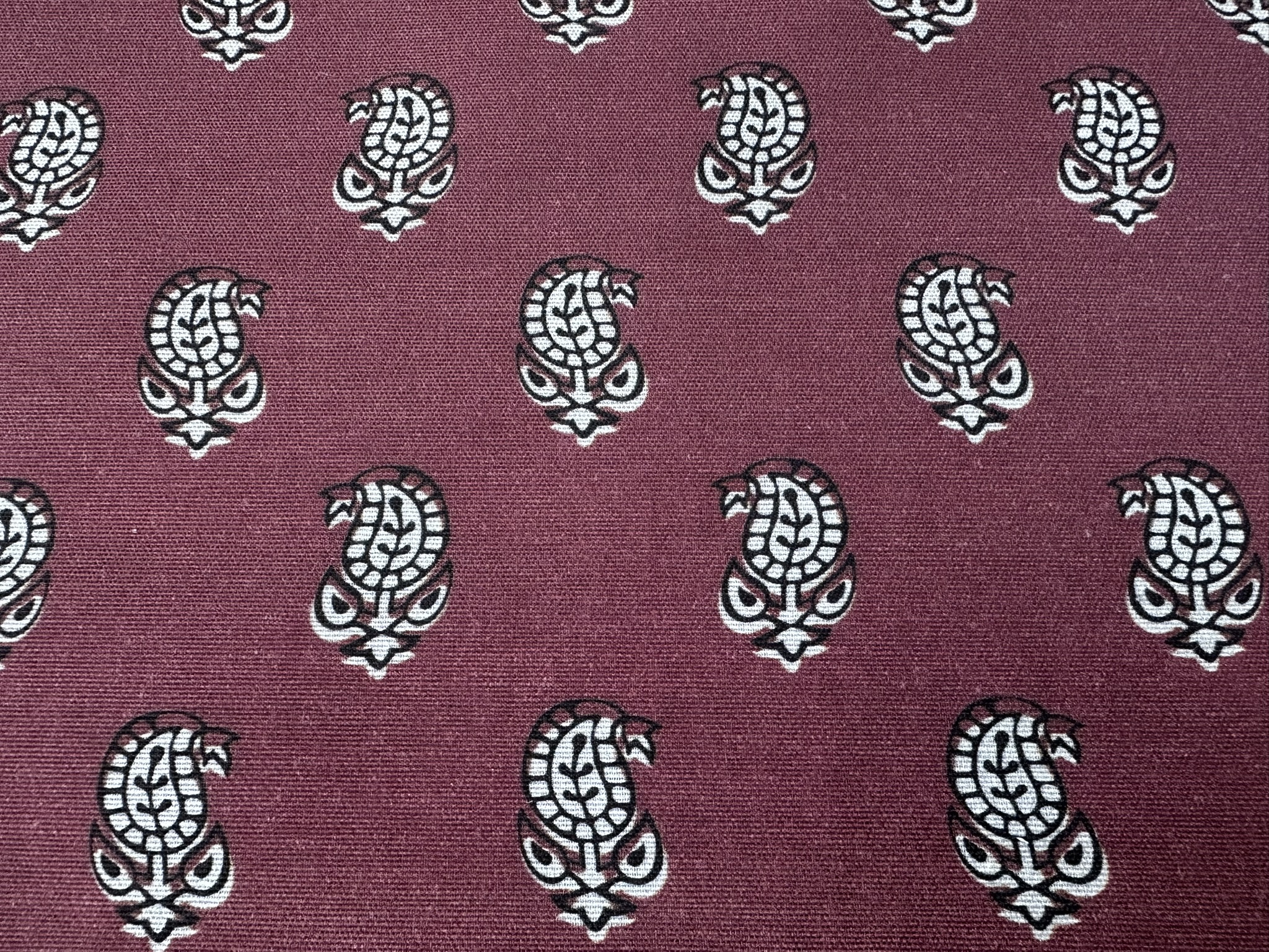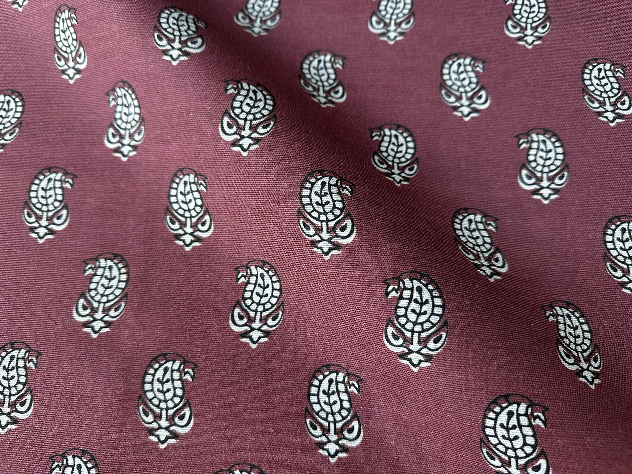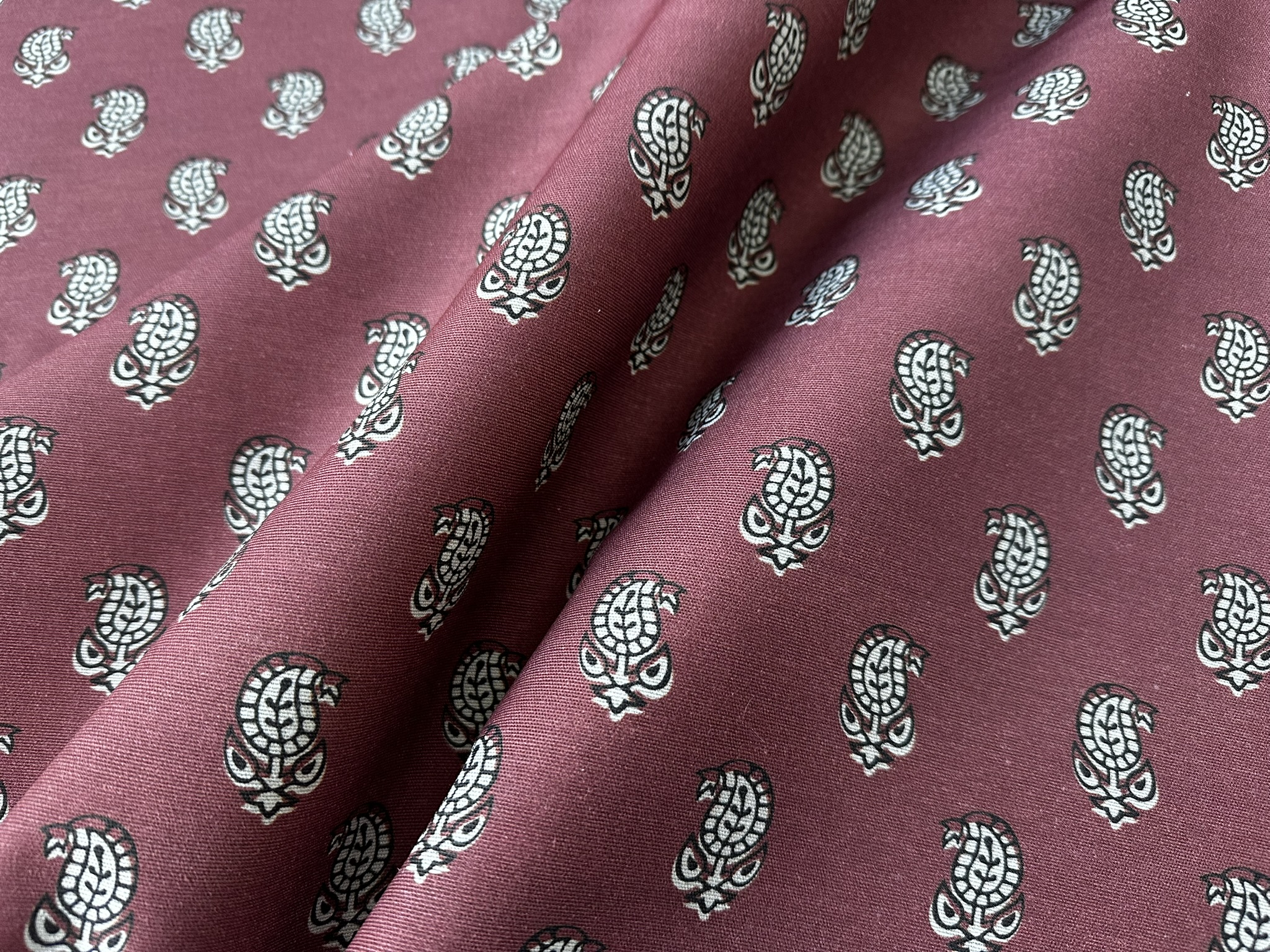 A beautiful Indian paisley block print fabric featuring a small black and cream motif on a rich burgundy background, perfect for light upholstery, curtains, cushions and crafts, with a durable yet soft cotton-polyester blend that’s easy to work with and washes well.