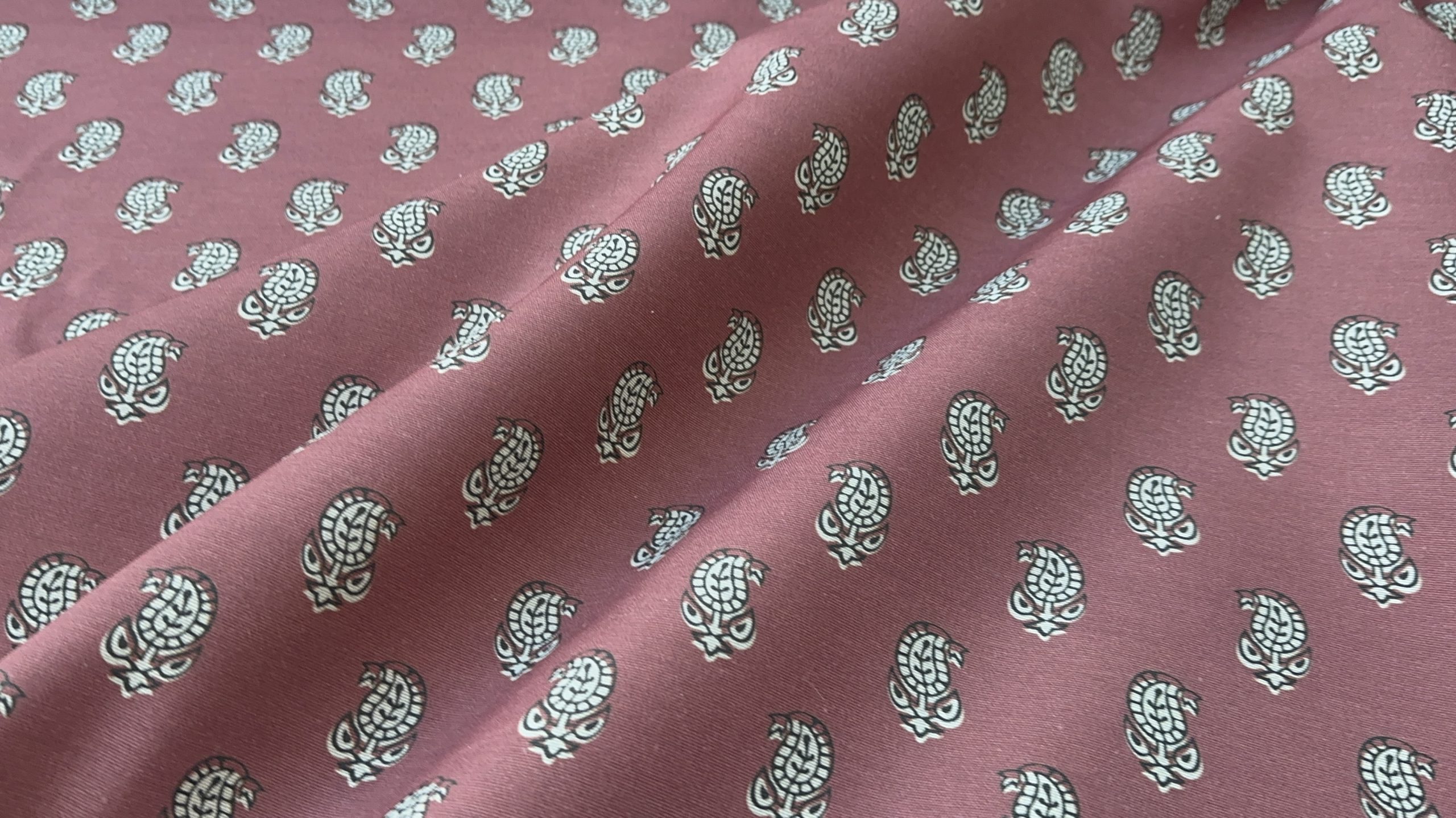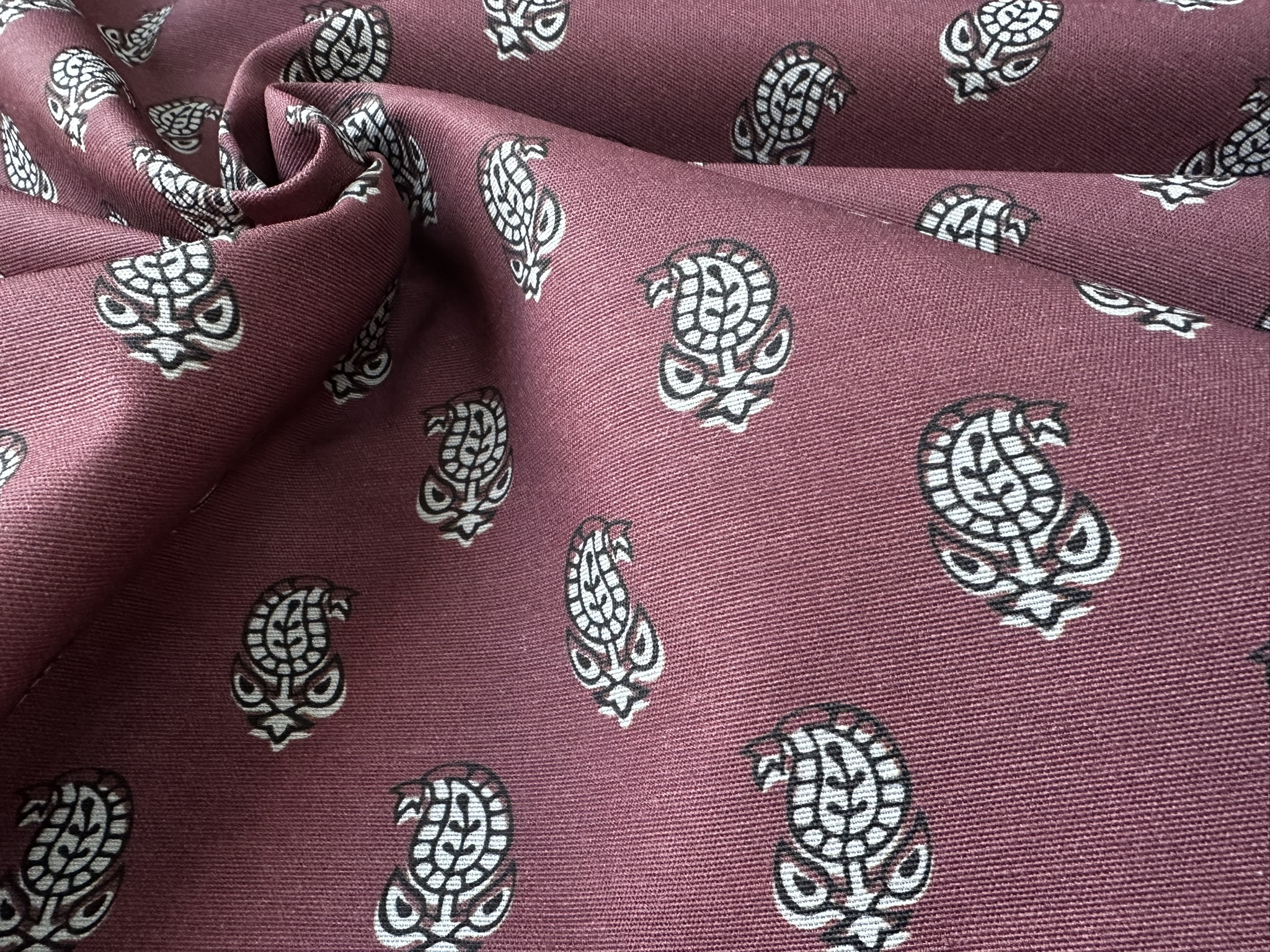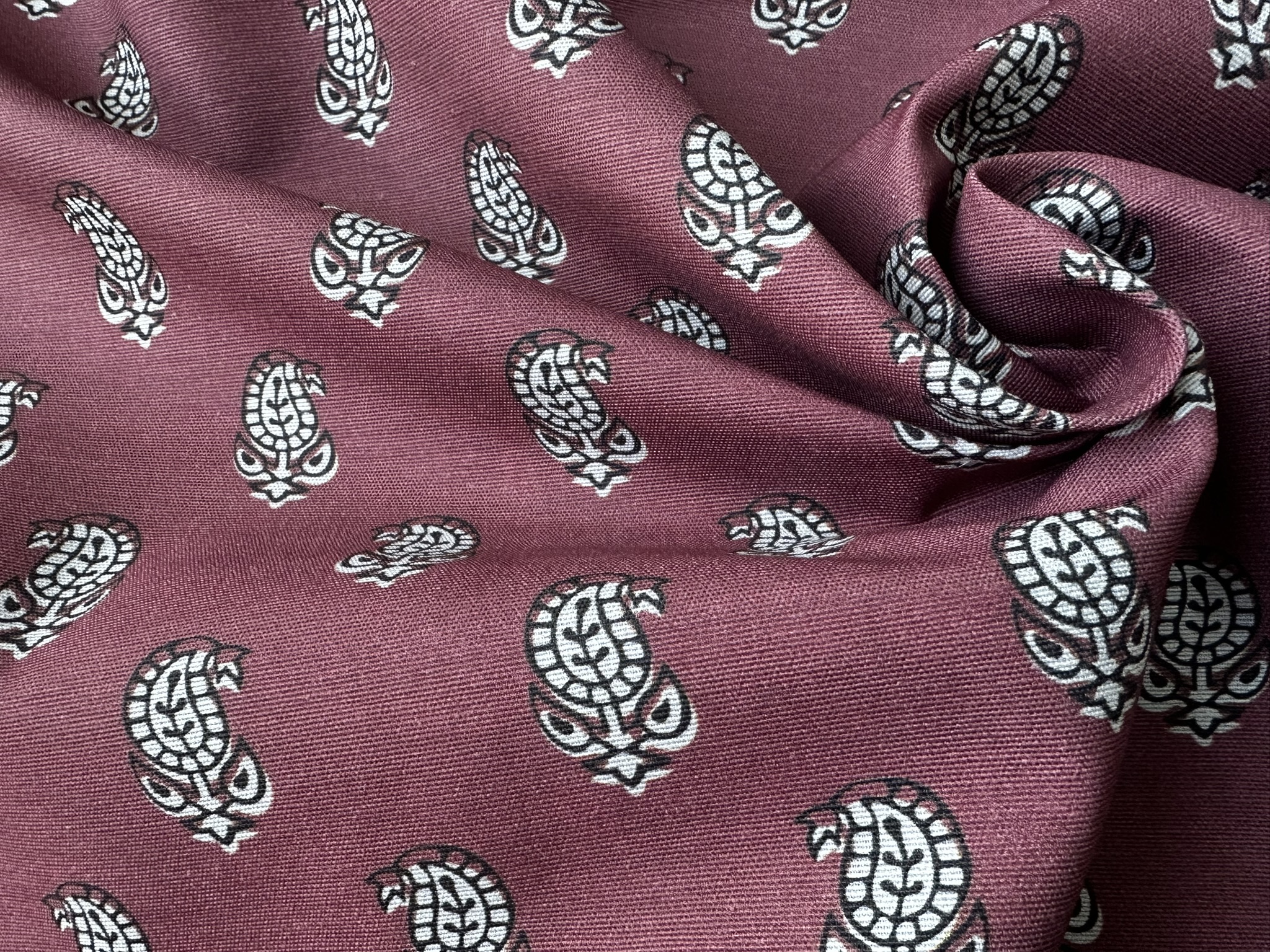 A beautiful Indian paisley block print fabric featuring a small black and cream motif on a rich burgundy background, perfect for light upholstery, curtains, cushions and crafts, with a durable yet soft cotton-polyester blend that’s easy to work with and washes well.