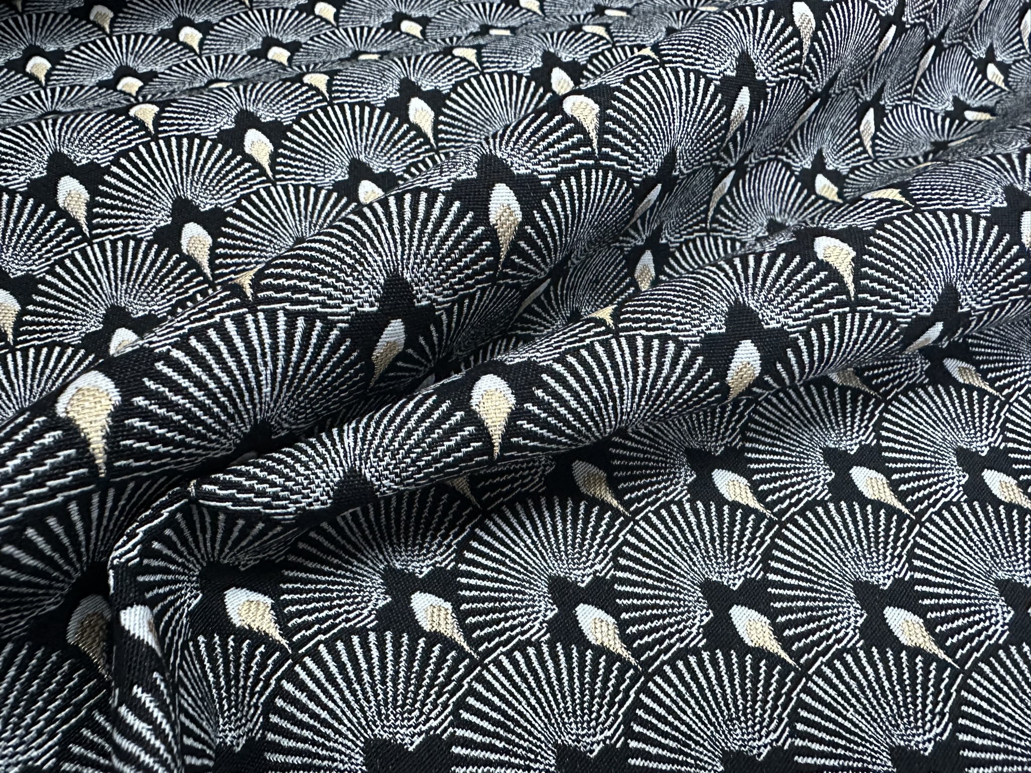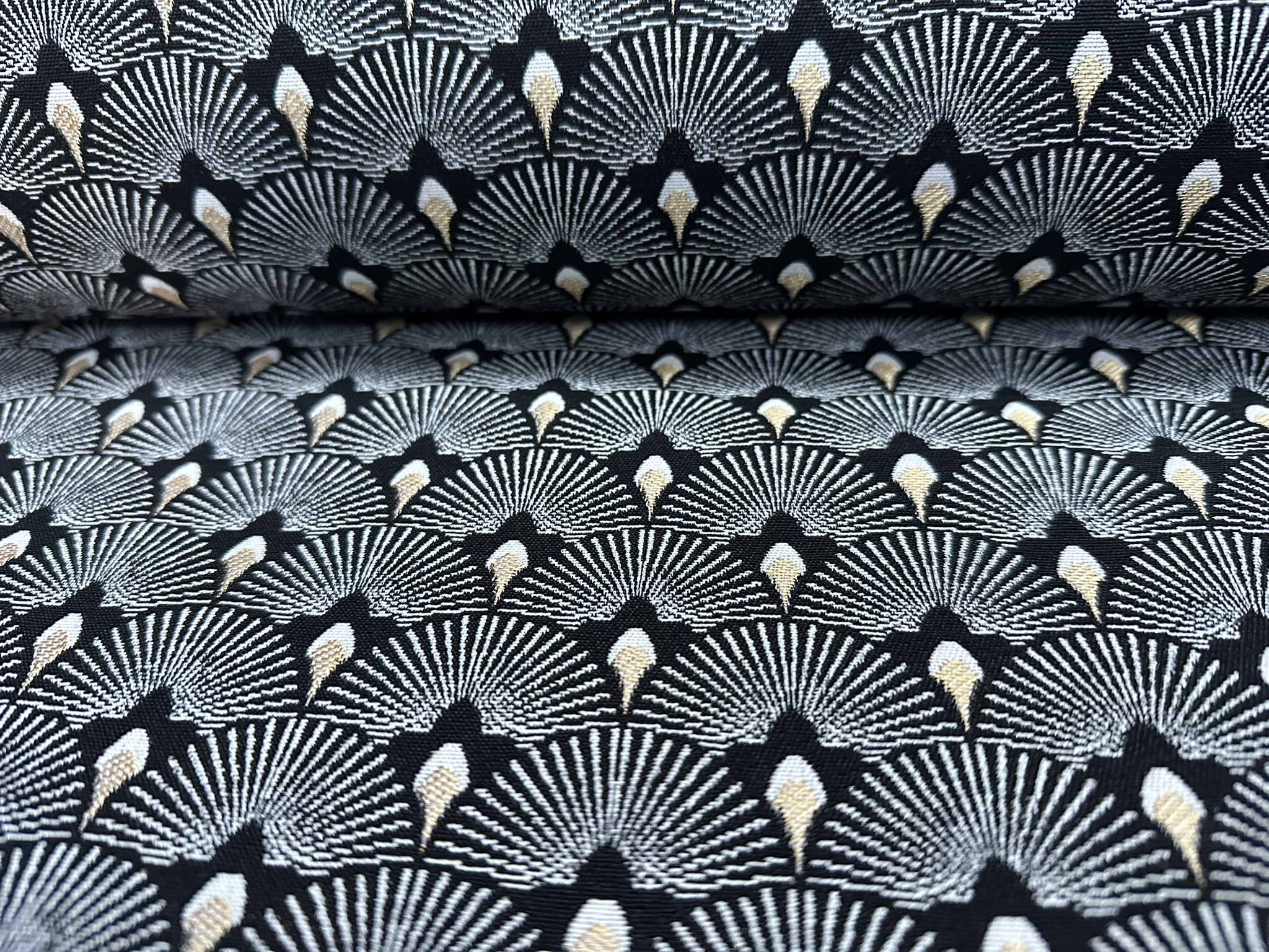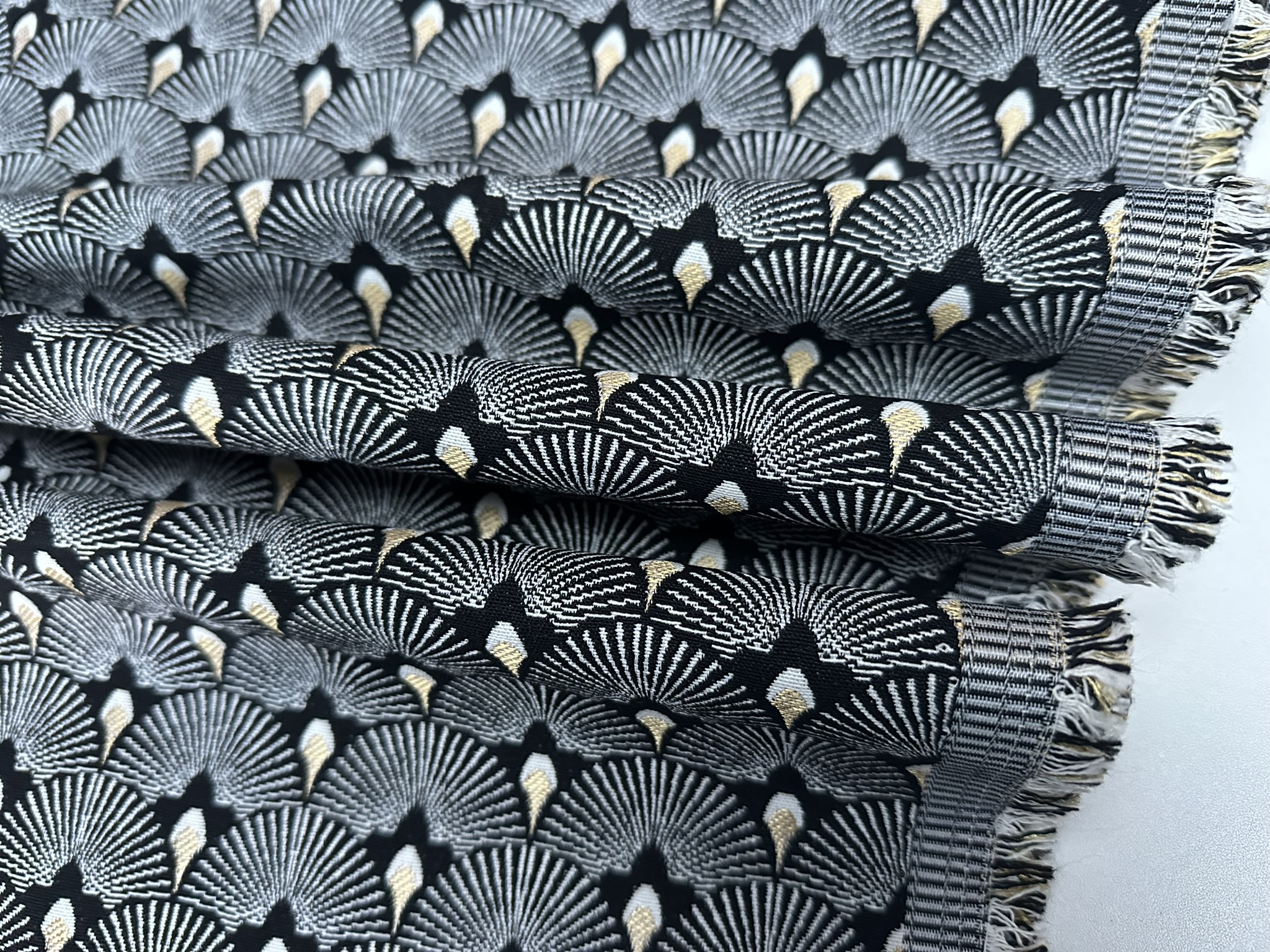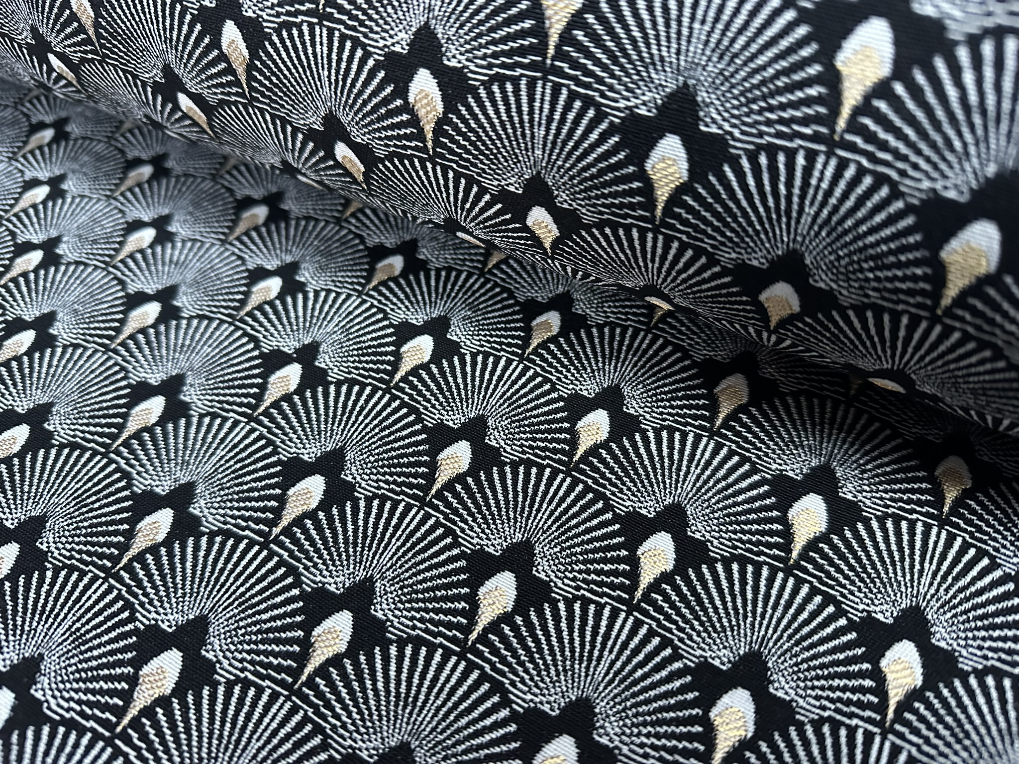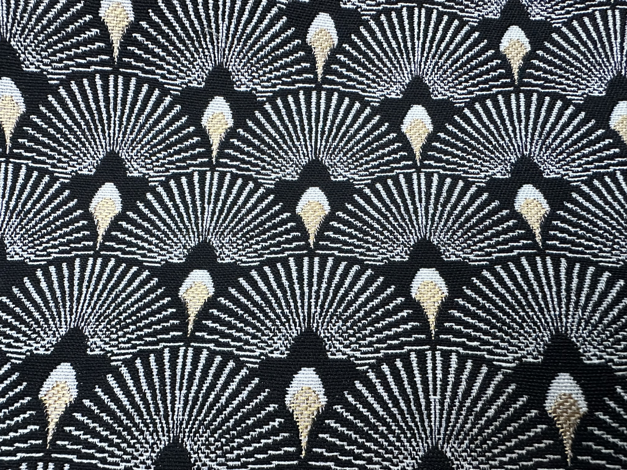 This luxurious jacquard gobelin fabric features an elegant Art Deco–inspired scale pattern, woven in rich black with shimmering gold metallic accents. The detailed geometric design and textured weave give it a high-end, decorative feel, perfect for statement interiors.