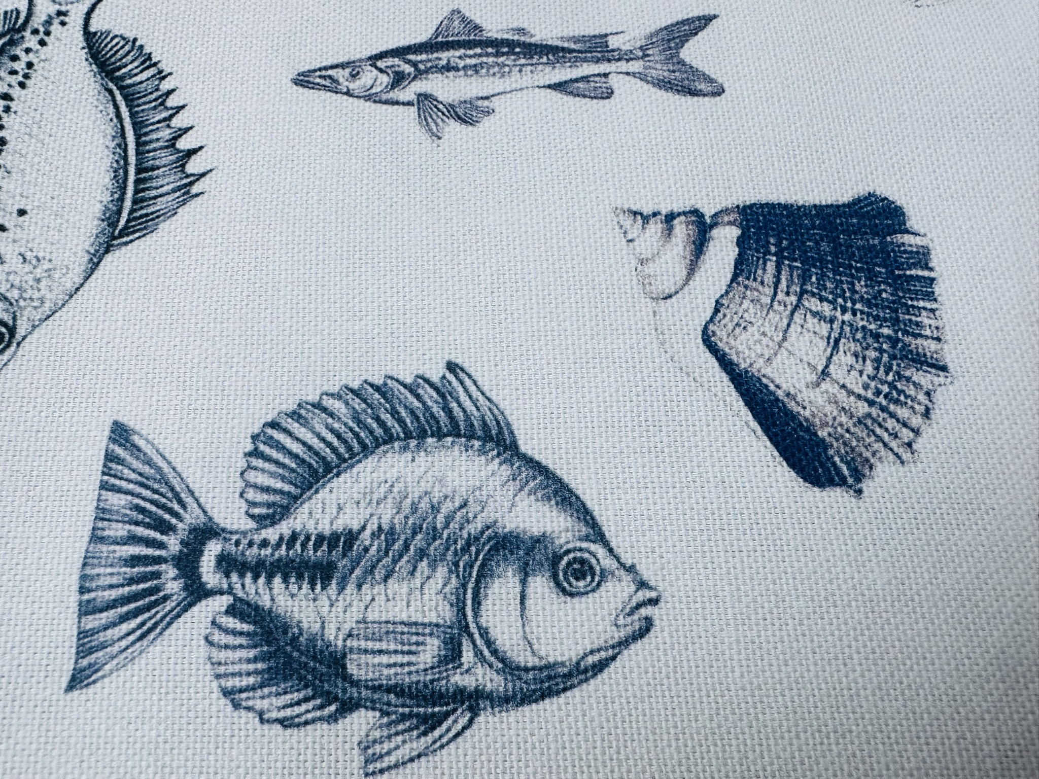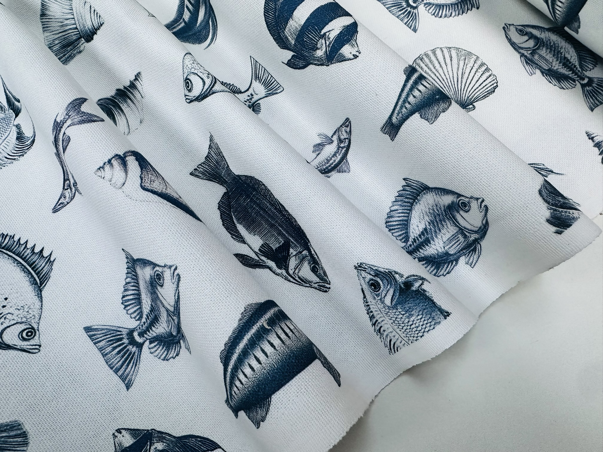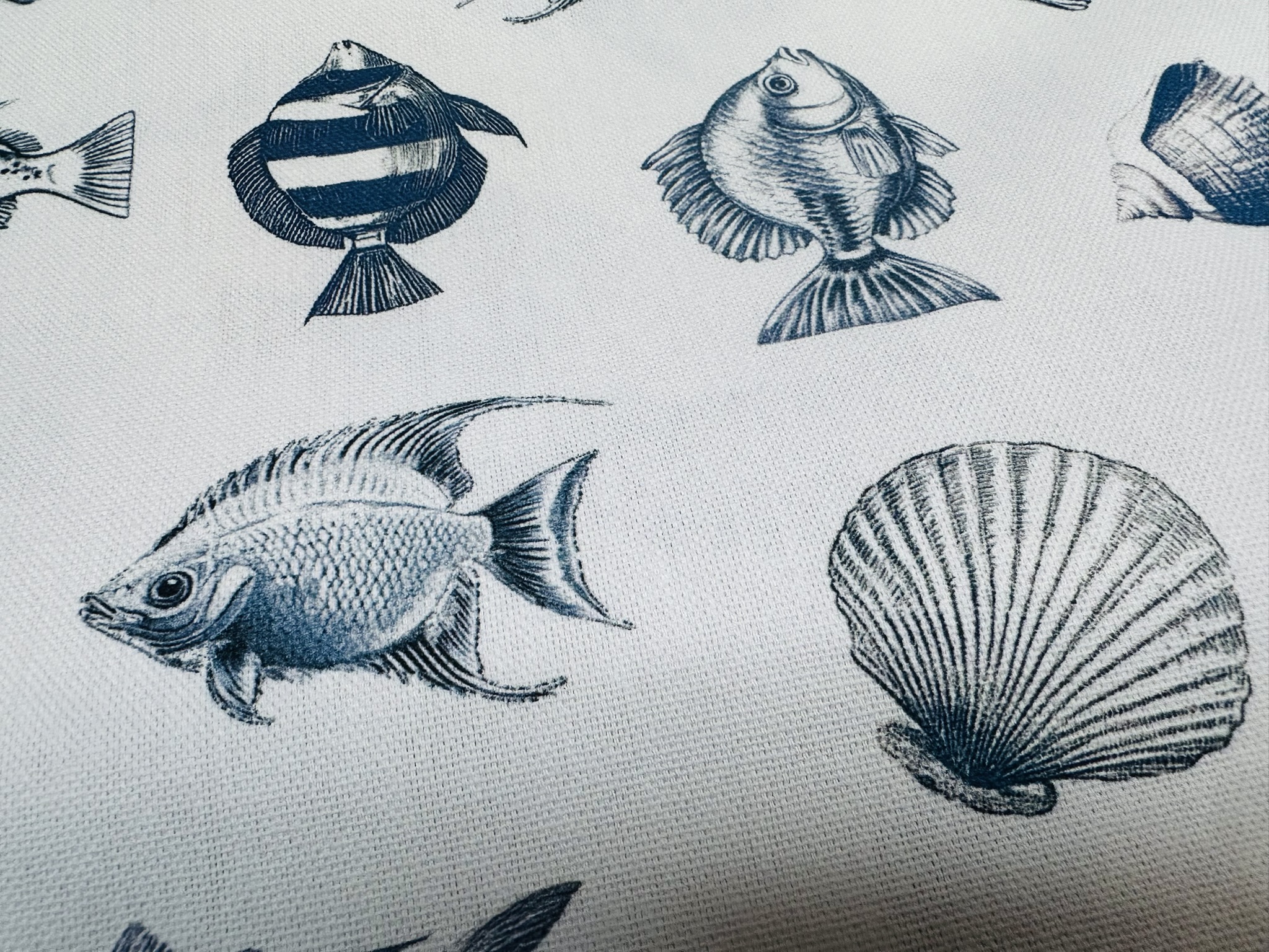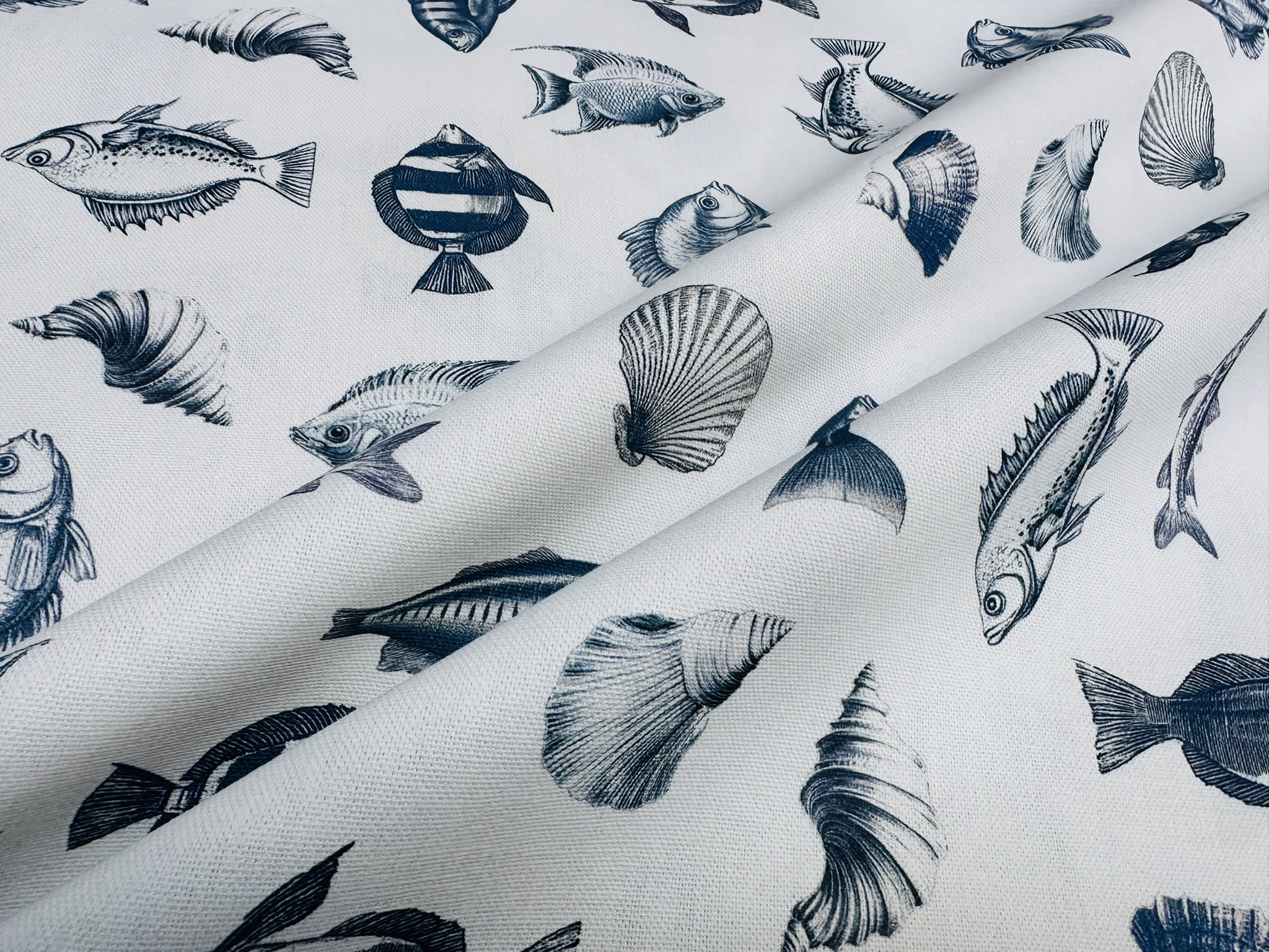 Featuring elegant sketched fish and seashell illustrations in navy blue on a soft natural background, this design is ideal for coastal interiors, cushions, curtains, table runners, tote bags, and craft projects.