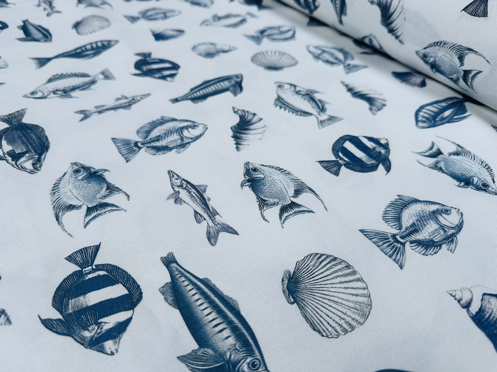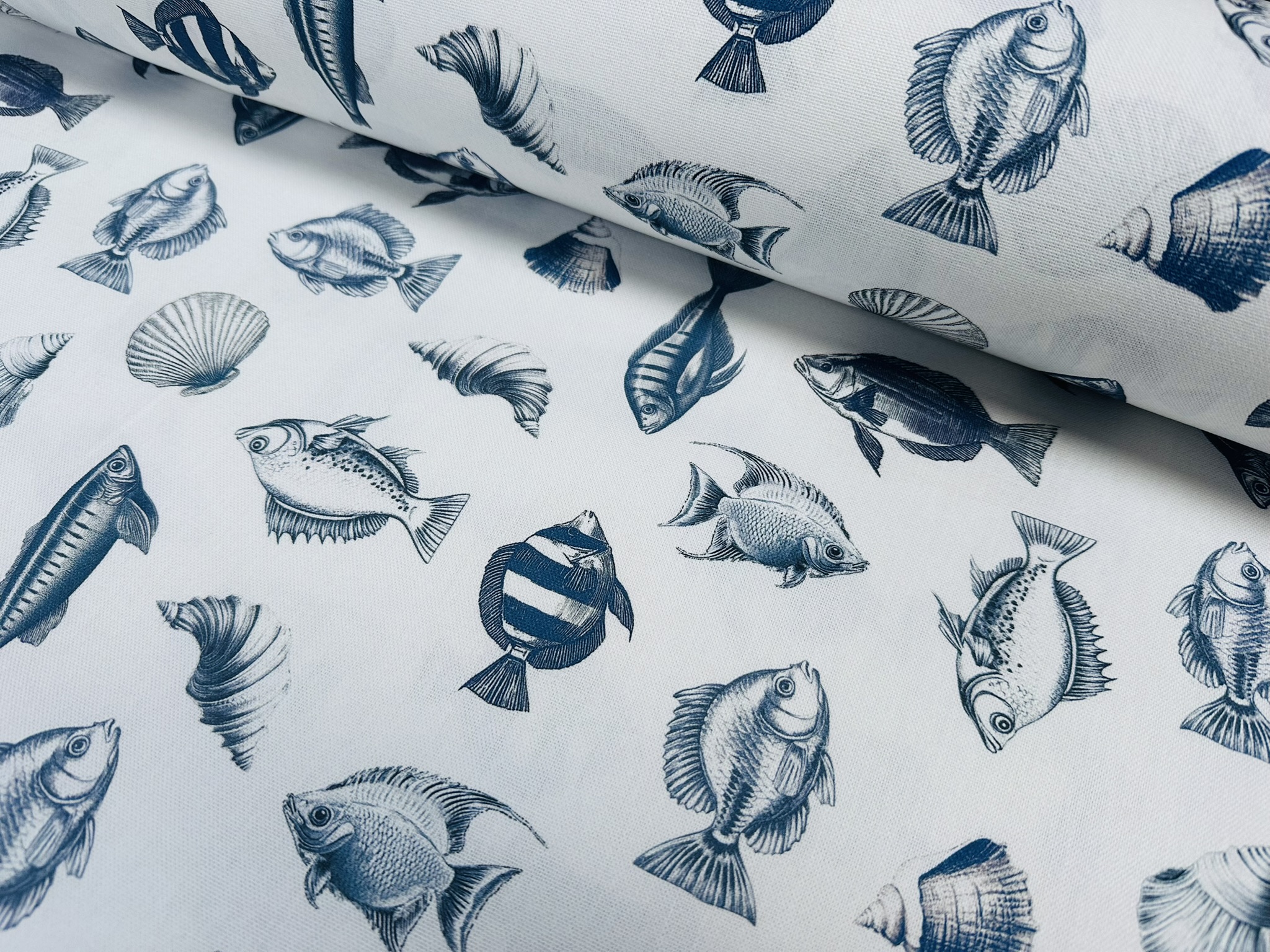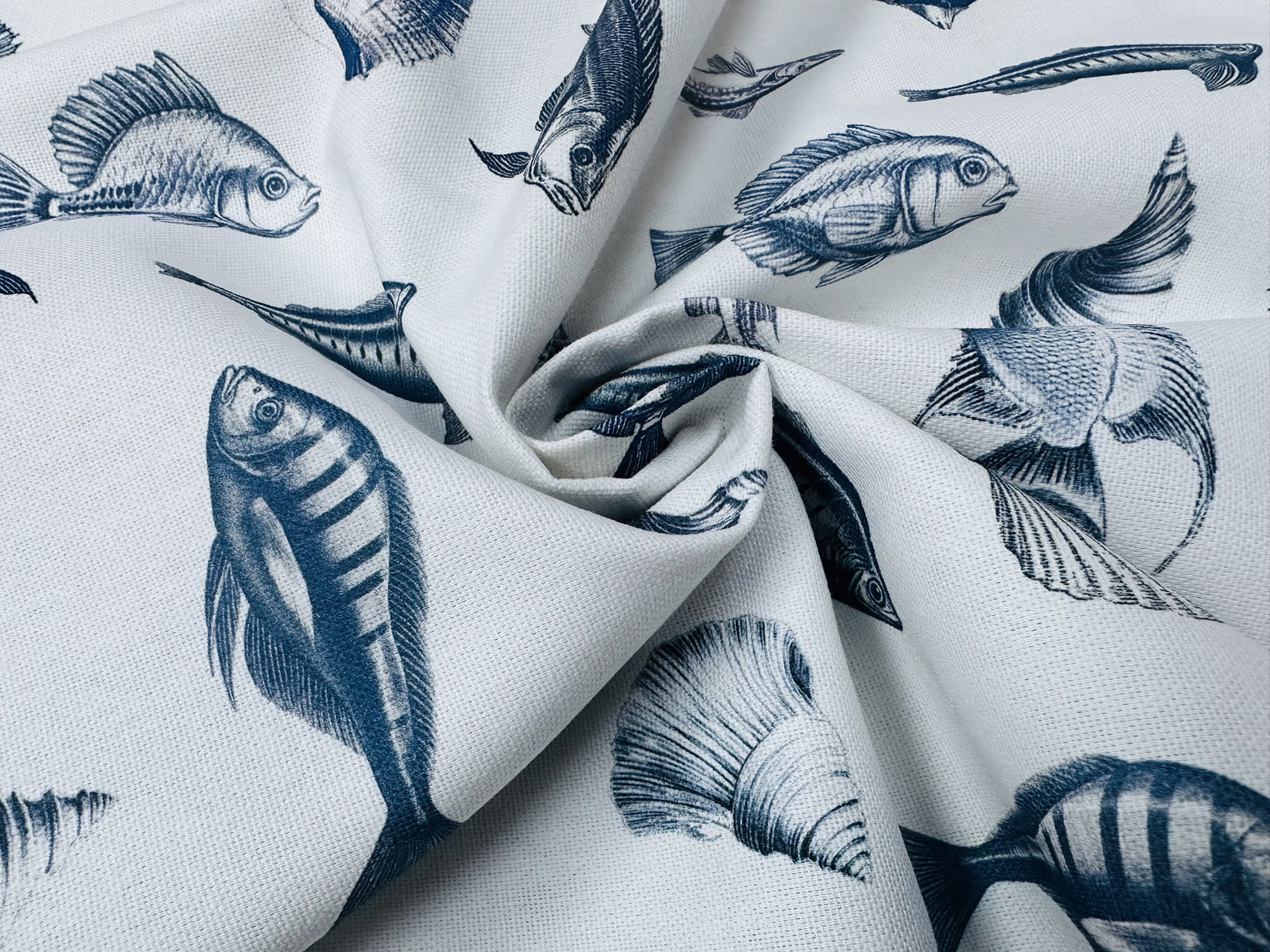Bring a refreshing seaside touch to your projects with this beautiful Navy Fish Fabric.