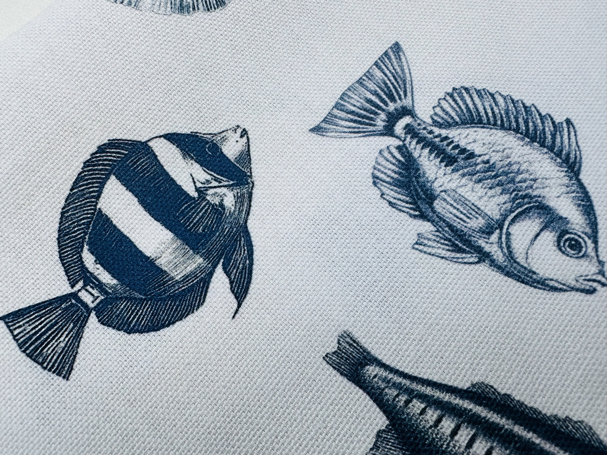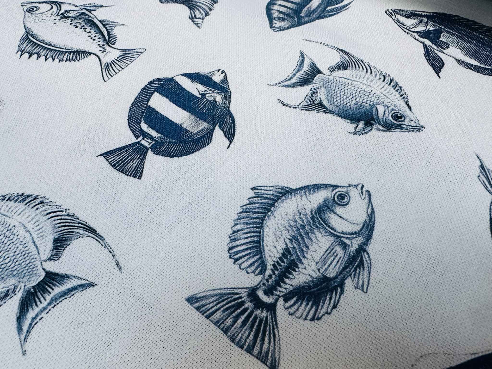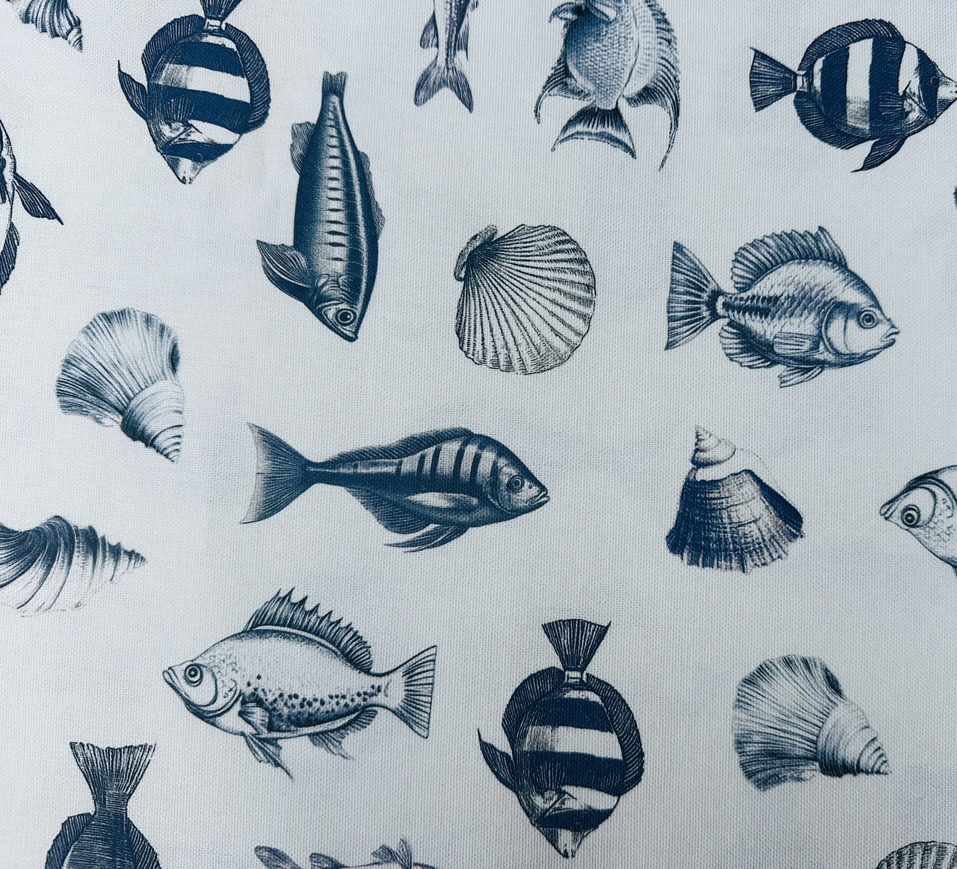 Bring a refreshing seaside touch to your projects with this beautiful Navy Fish Fabric.