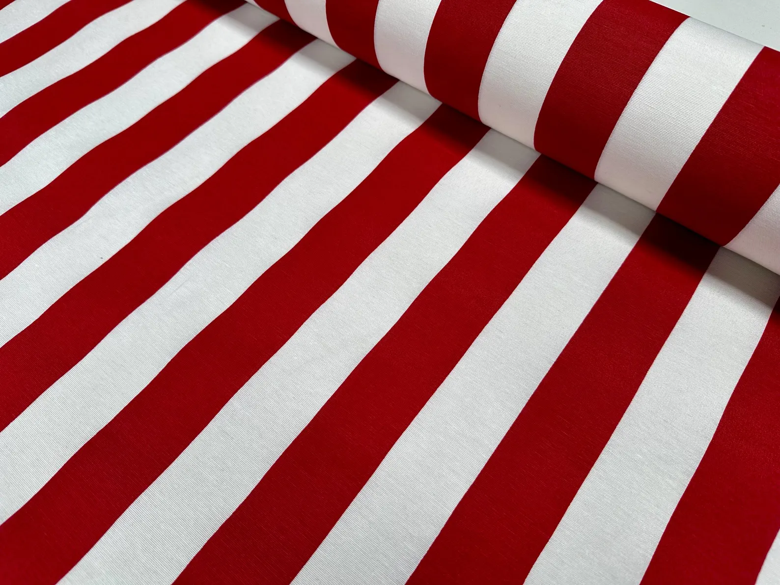 Add a bold, classic touch to your projects with this striking red and white broad-striped fabric. Featuring versatile 4cm wide stripes, this medium-weight fabric has a stylish linen-look texture, perfect for a range of creative uses. A stylish and practical choice for upholstery, decor, and artistic creations!