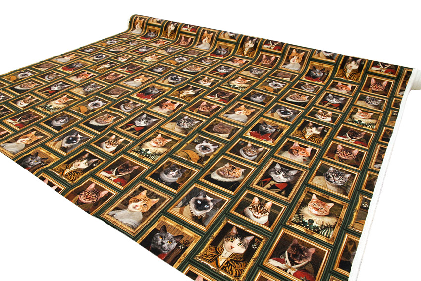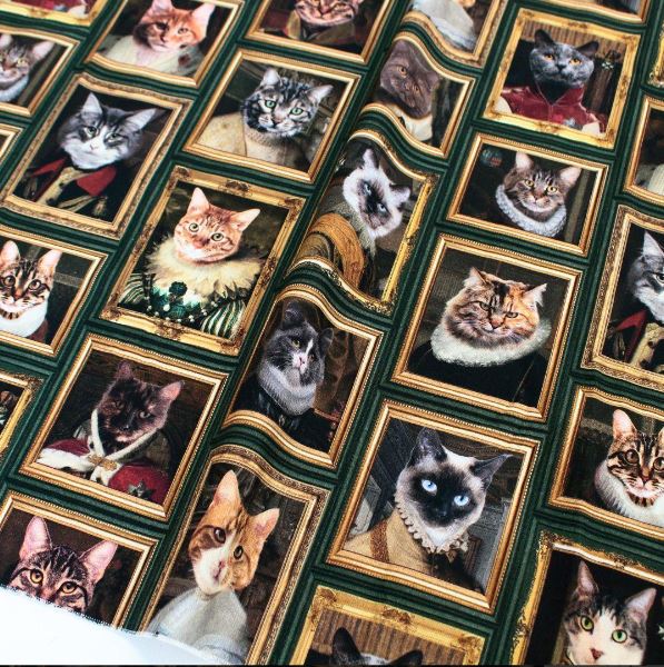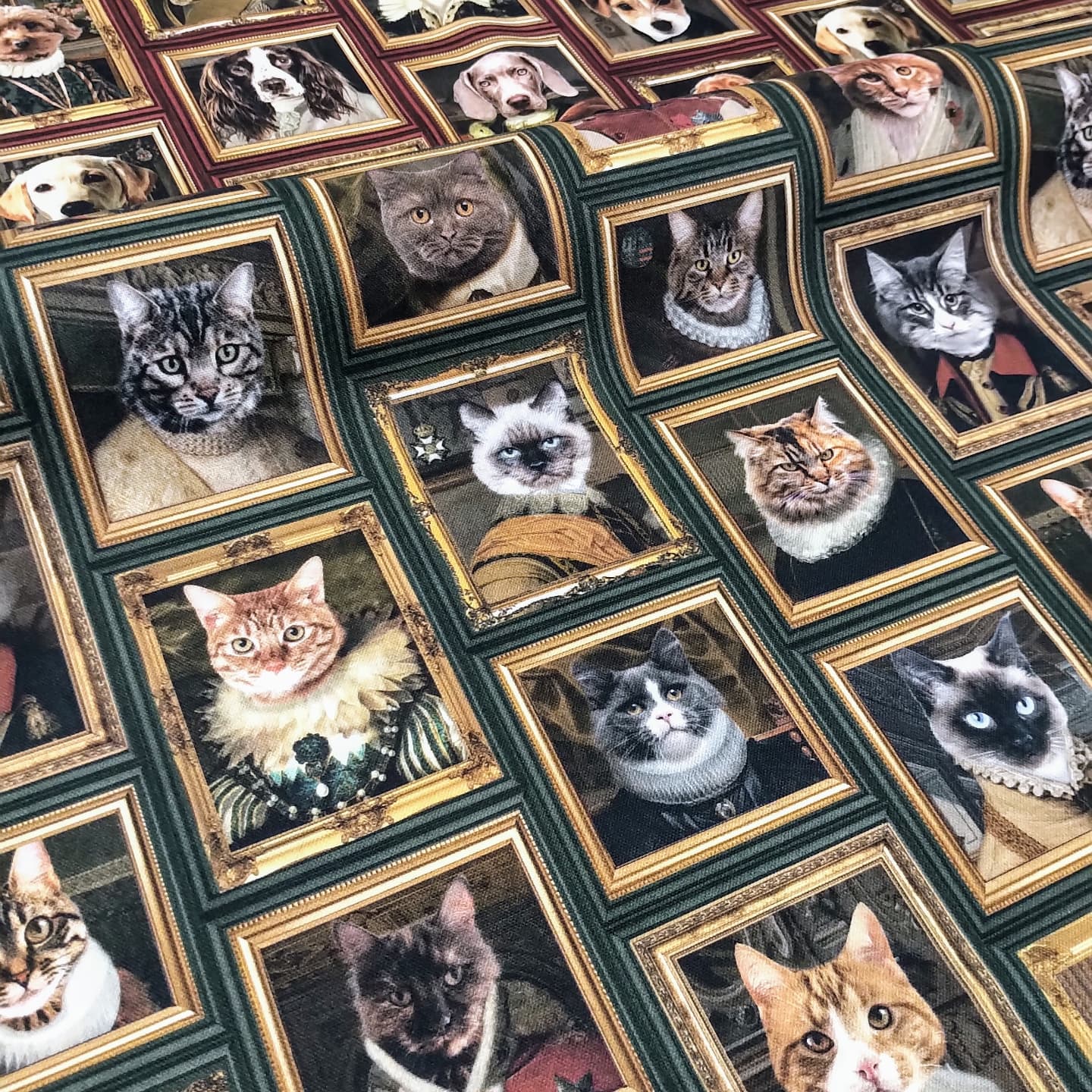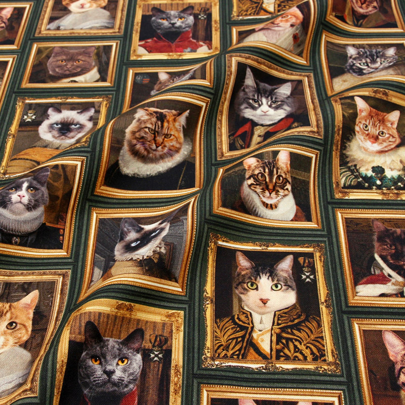 Royal Cats Fabric for Home Decor Upholstery Curtains – Animal Portrait Print with Golden Frames – 140cm Wide