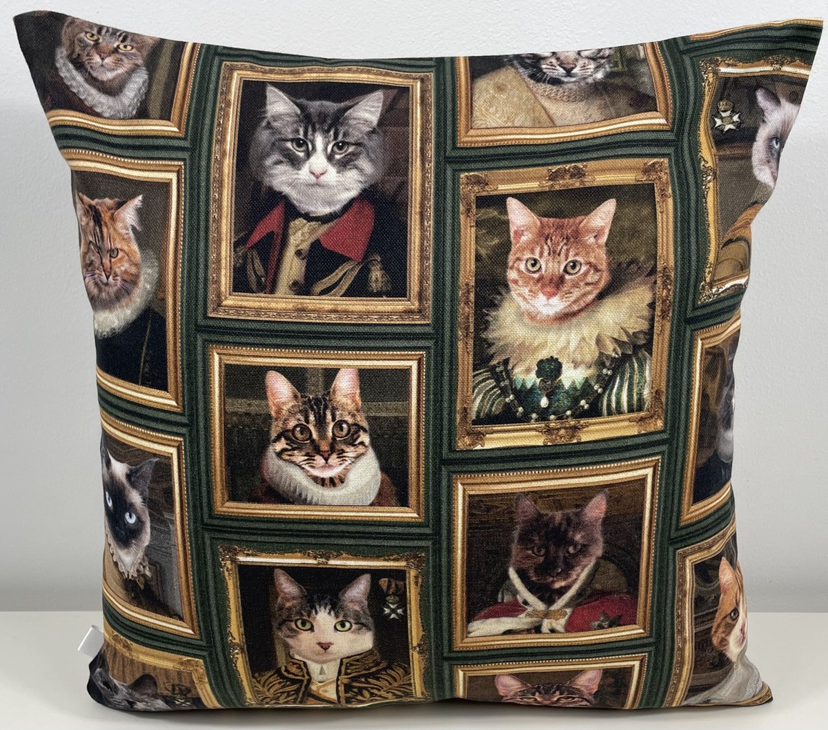 Each majestic cat is dressed in regal attire and framed in gold, creating a unique and playful design perfect for curtains, upholstery, cushions, table runners, and crafts.