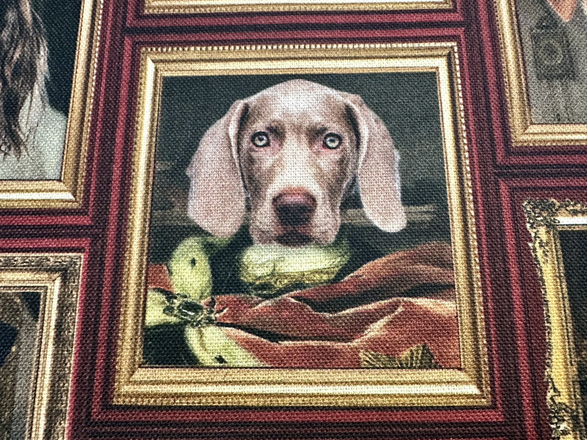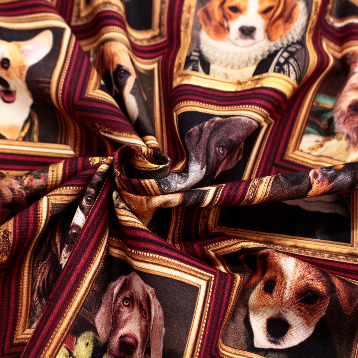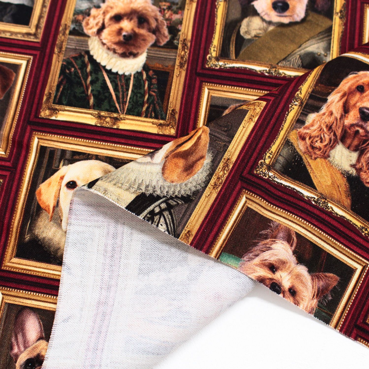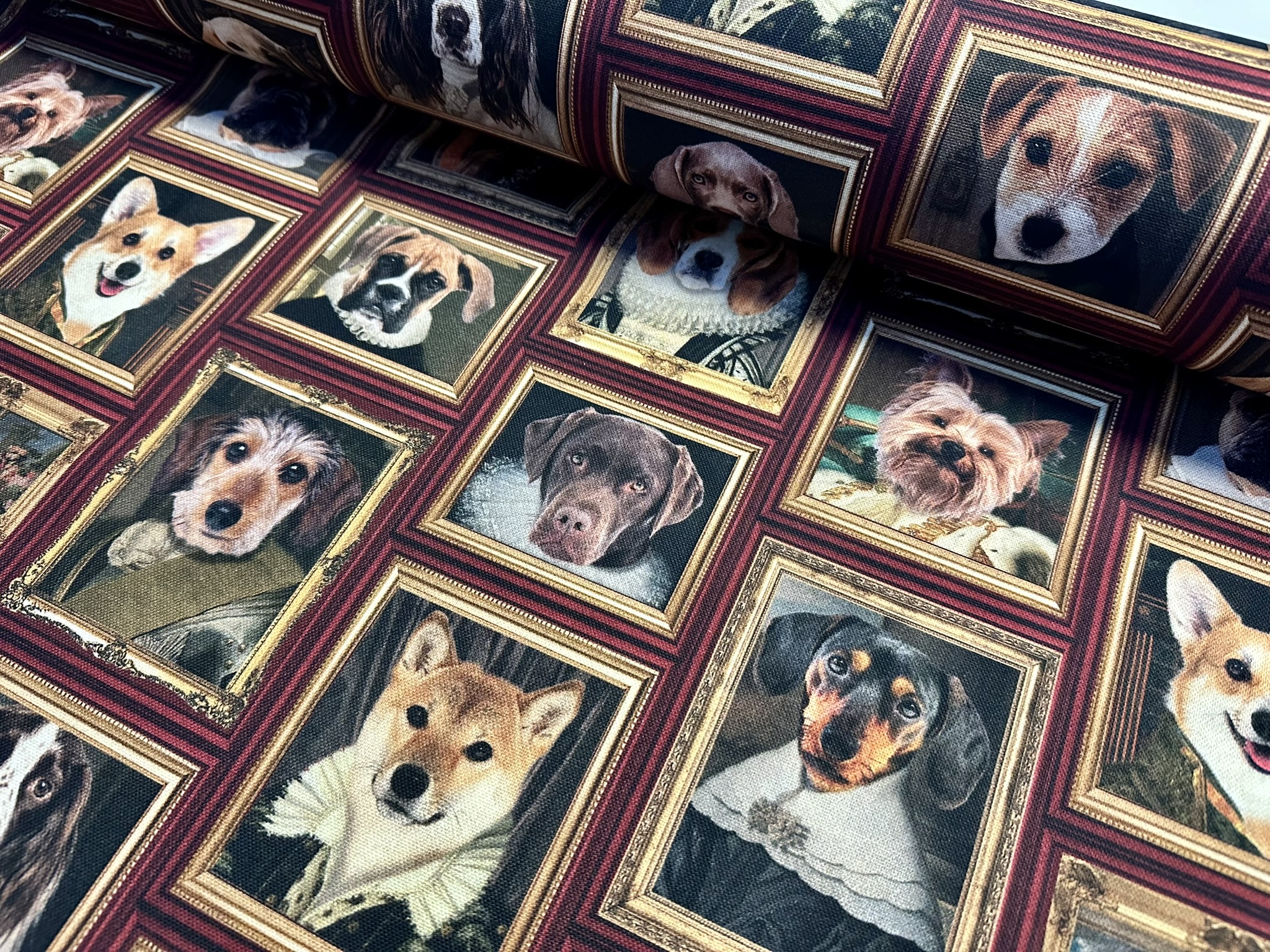 Royal Dogs Fabric for Home Decor Upholstery Curtains – Animal Portrait Print with Golden Frames – 140cm Wide