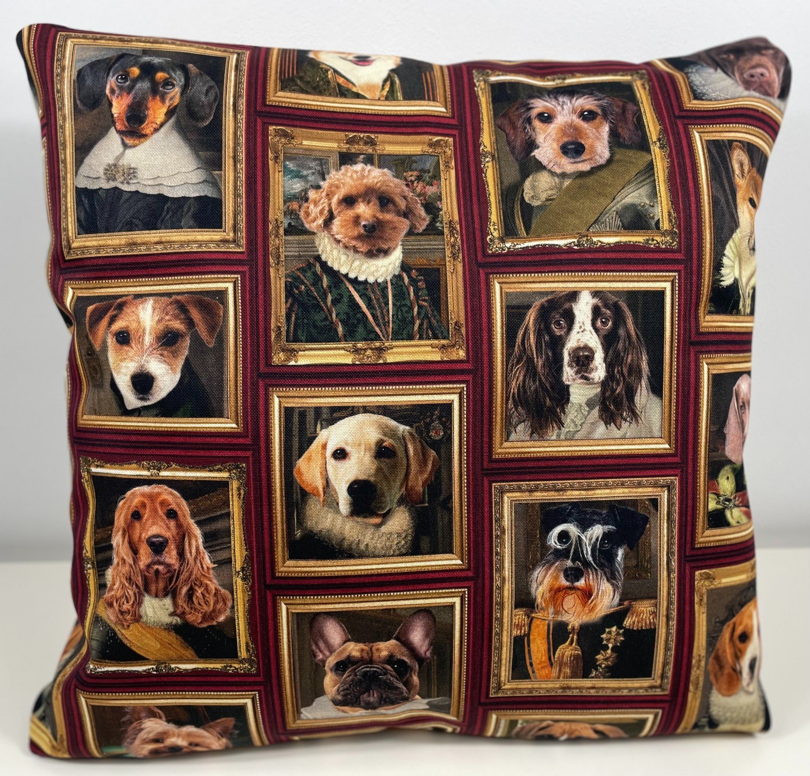 Each noble pup is framed in gold, creating a unique and playful design perfect for home décor, upholstery, cushions, curtains, and crafts.